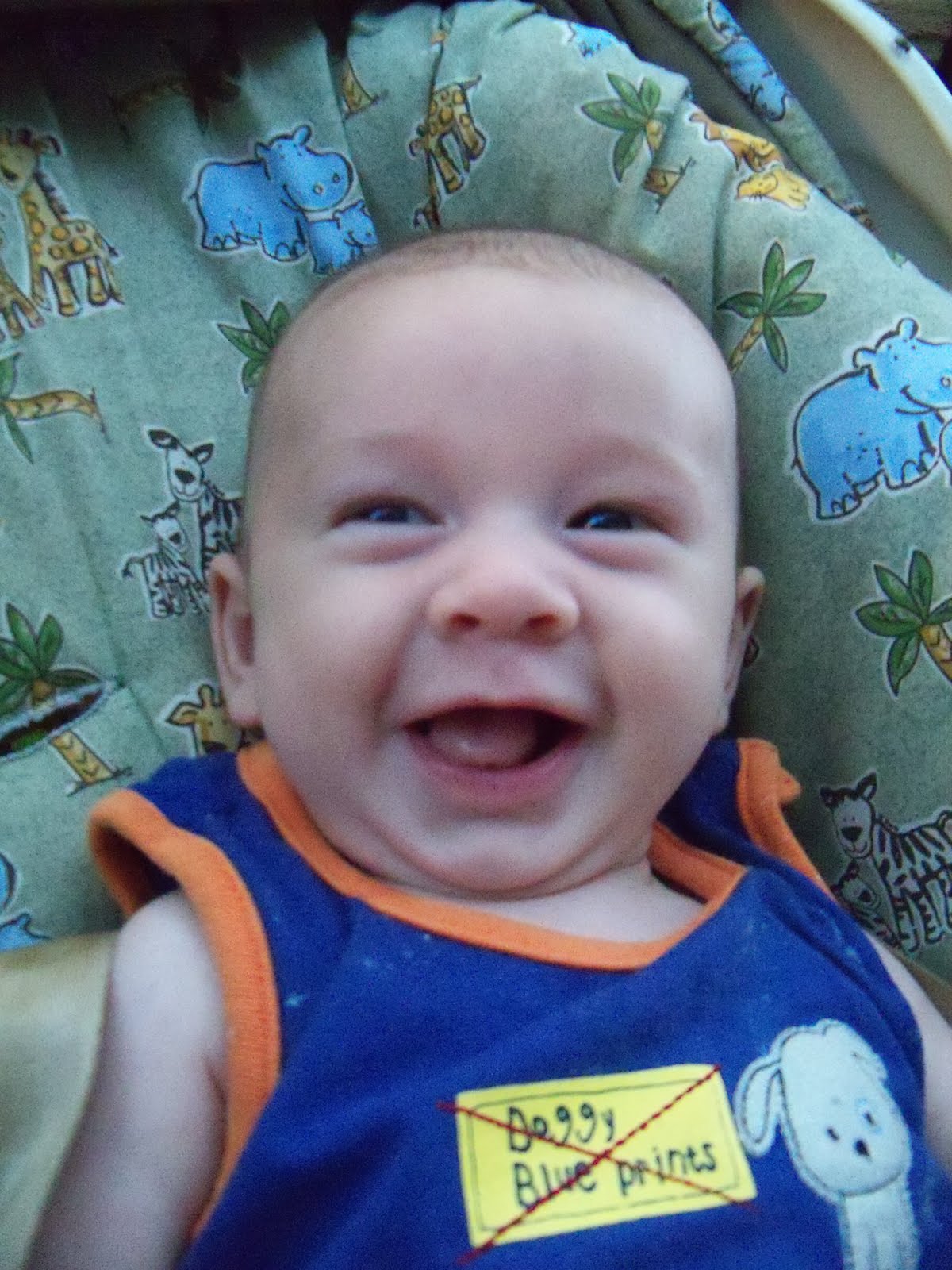 The morning that Wyatt turned 3 months old I heard him babbling in his crib as I was getting ready. Soon the noises changed to a little more urgent and I went to investigate. He had rolled over in his crib from back to front! They say that happens at 5-6 months! I was worried I don't give him enough tummy time since there is a toddler and pets running around, but I guess now he will do it himself!